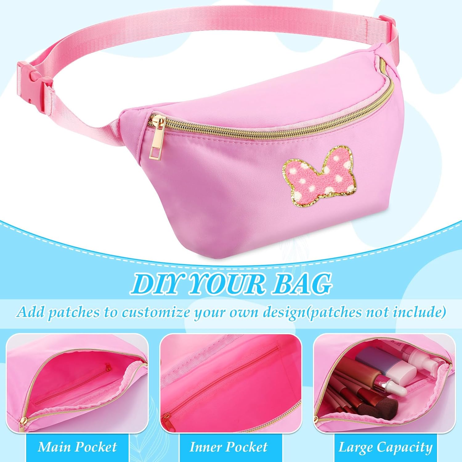 DIY as You Like: you can DIY the fanny bag with various accessories, such as patches, key chains, stickers, and you can also draw some patterns on the pack with your friends, showing your style and personality