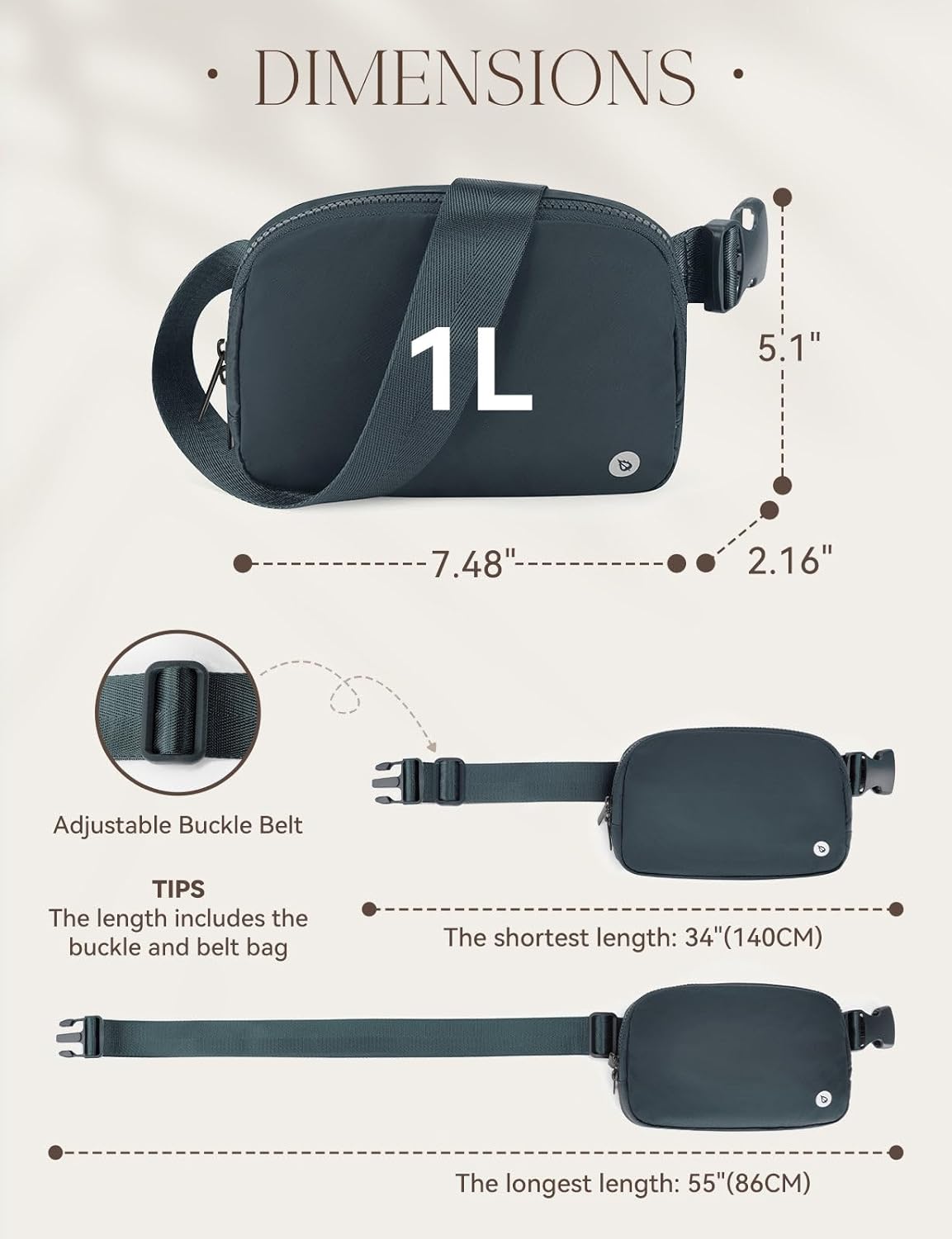 DIMENSIONS: The belt bag for women appearance size 7.48” X 2.16” X 5.1”(19cm X 5.5cm X 13cm); large Range Adjustable strap: 34” to 55”(86cm ~ 140cm) —Includes the buckle and bum bag; volume: 1L.