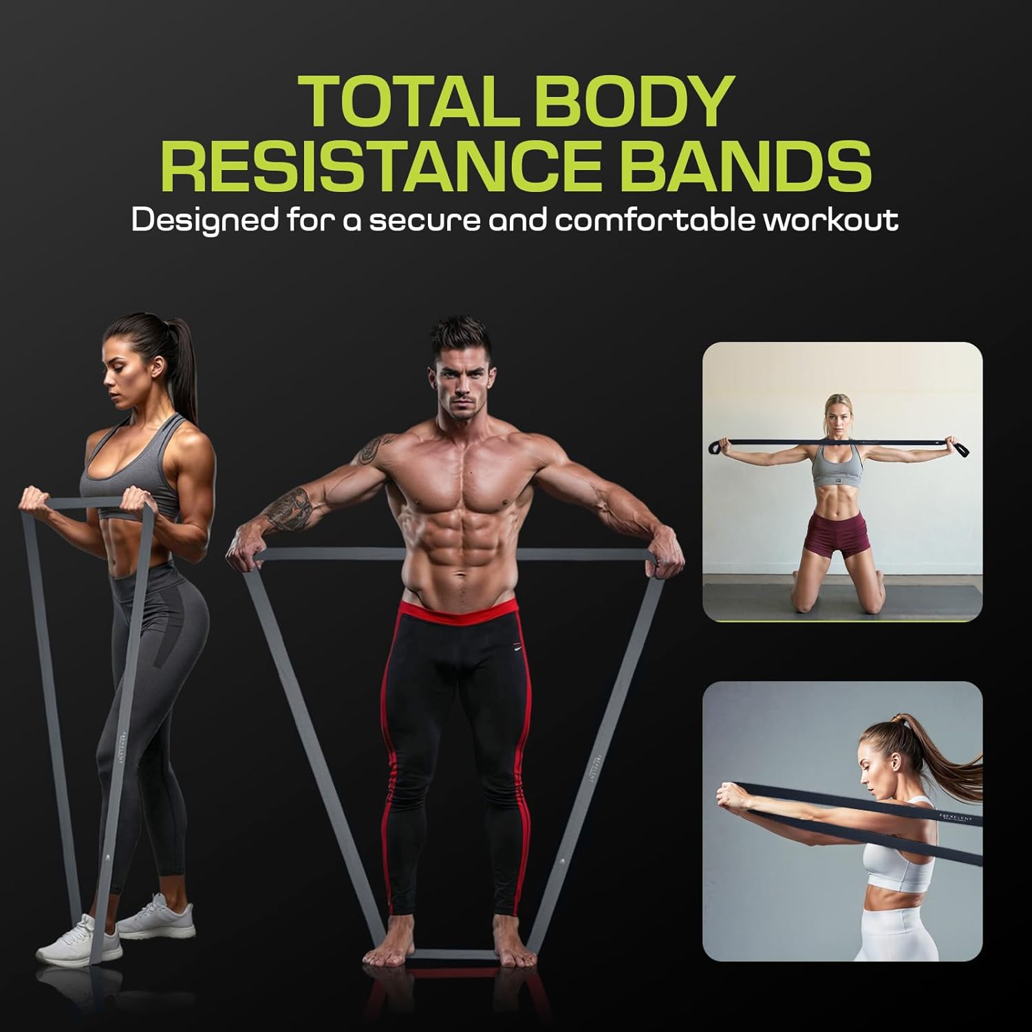 Flexelent heavy-duty resistance bands for pull ups are made from tear-resistant material, ensuring durability for lifting, powerlifting, and strength training. These long resistance bands for working out provide elasticity for years without snapping, making them ideal for gym bands resistance and training bands. Designed for a full-body workout, they target muscles in the back, legs, arms, and glutes, enhancing pull up assistance and core conditioning. Suitable for all fitness levels, from beginners to advanced athletes, the pull up resistance bands come in various resistance 5 levels to scale intensity. The long exercise bands are portable and fit easily in a gym bag, perfect for home, travel, and outdoor workouts. These work out bands assist with injury rehabilitation, stretching, and mobility training. Ideal for men and women, the gym resistance bands support pull up assistance bands and rehab exercises.